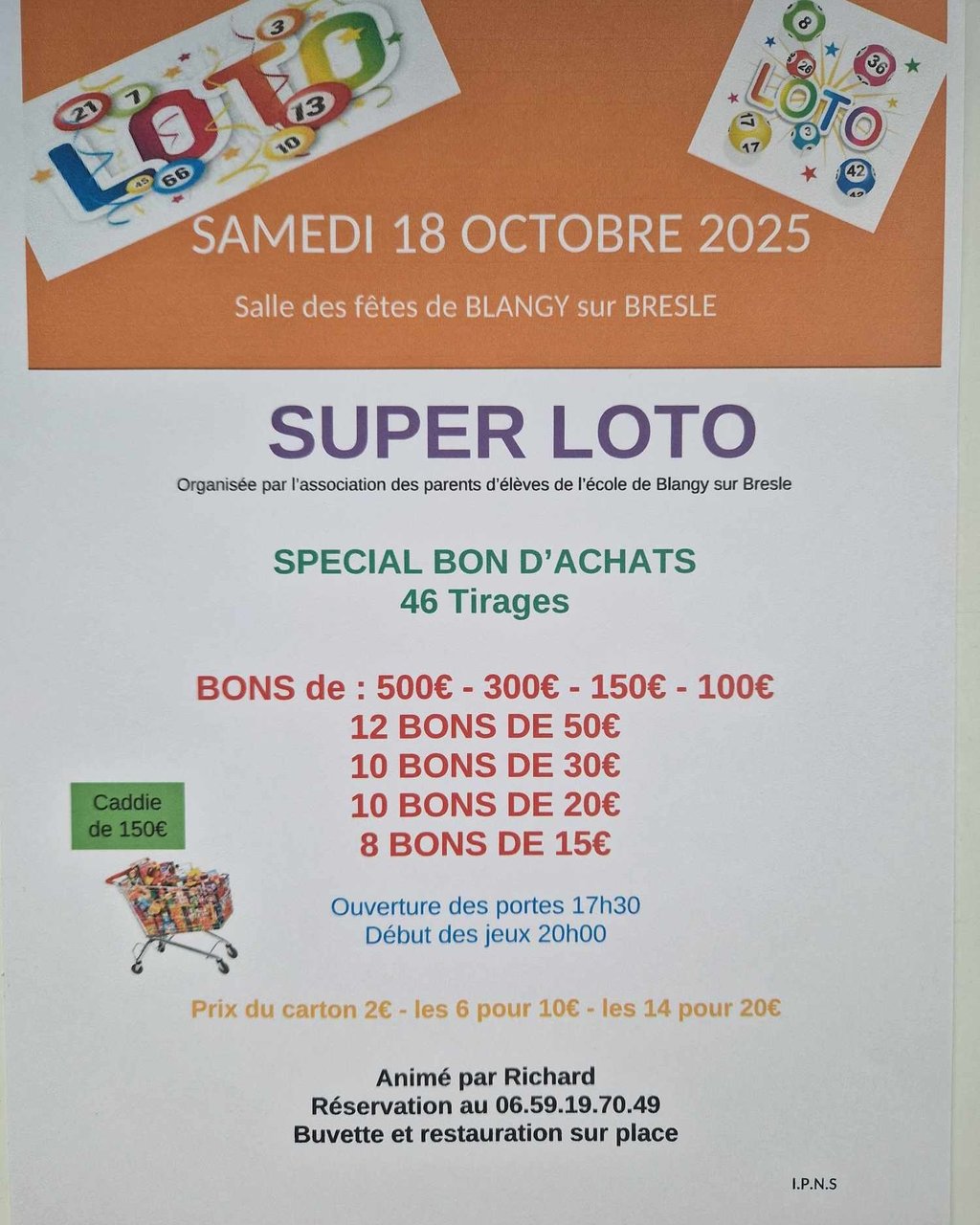Loto de l'Association des parents d'élèves de l'école de Blangy-sur-Bresle.Spécial bons d'achat - 46 tirages.🎤 Animé par Richard.🌭 Buvette & restauration sur place.📞 Réservations au 06 59 19 70 49. Horaires de l'évenement : Ouverture des portes : 17h30 | Début des jeux : 20h Prix de l'événement :