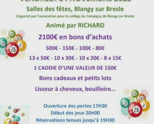 Loto de l’Association pour le collège du Campigny Animé par Richard 🎤📞 Réservation au 06 59 19 70 49.🌭 Buvette & restauration sur place. Horaires de l’évenement : Ouverture des portes…