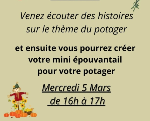 Venez écouter des histoires sur le thème du potager 🥕et ensuite, vous pourrez créer un mini épouvantail pour votre potager 🍅A partir de 3 ans. Horaires de l’évenement : De 16h à…