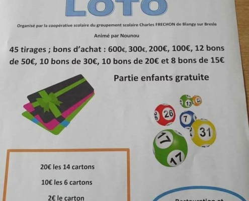 LOTO du groupement scolaire Charles Frechon, animé par Nounou.👉 Partie enfants gratuite.🌭 Restauration et buvette sur place.✅ Réservations au 06 59 19 70 49 ou 06 20 29 44 13. Horaires…