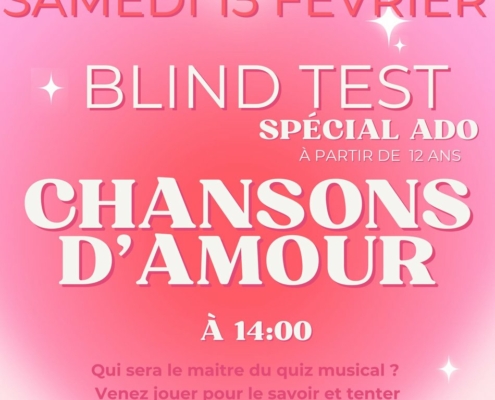 ***Nouveau à la ludothèque*** Blind test spécial ados sur les chansons d’amour 💕Qui sera le maître du quiz musical ? 🎤 Horaires de l’évenement : 14h Prix de l’événement : Gratuit