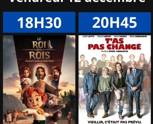 Retrouvez vos 2 séances de cinéma 🍿 18h30 : Le Roi des Rois 20h45 : T’as pas changéFilms diffusés sur un écran de 10 mètres à la salle des fêtes de…