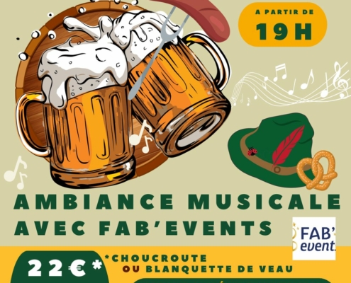 Fête de la Bière par la SEPBB Comité directeur 🍻Ambiance musicale avec Fab’Events 🎶🌭 Kir + Plat* + Fromage + Salade + Dessert : 22 € | *Choucroute ou blanquette de veau 🌭 Repas enfant (-12…