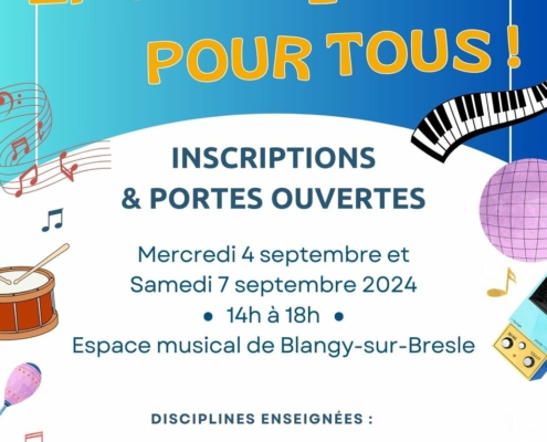 INSCRIPTIONS ET PORTES OUVERTES A L’ESPACE MUSICAL 🎶🎸 Mercredi 4 septembre Samedi 7 septembre➡ Renseignements auprès de Julien LHOTELLIER.📞 06 19 72 08 10📧 espacemusical@blangysurbresle.frDisciplines enseignées : flûte, clarinette, saxophone, trompette,…