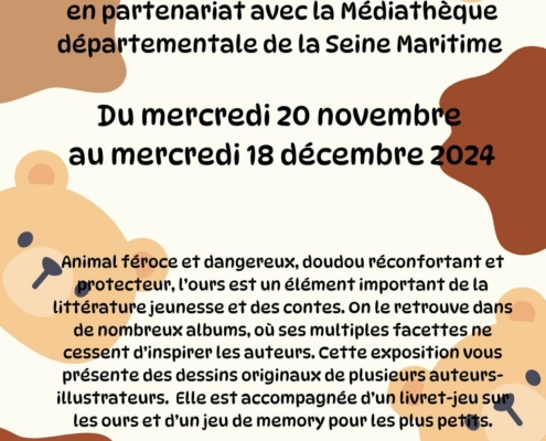 Exposition « Les ours » en partenariat avec la Médiathèque départementale de Seine-Maritime. Horaires de l’évenement : Prix de l’événement :