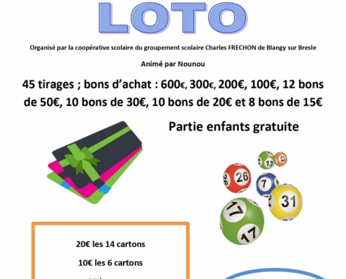 LOTO organisé par la coopérative scolaire du groupement scolaire Charles Frechon, animé par Nounou.📍 Salle des fêtes de Blangy-sur-Bresle⏰ Ouverture des portes à 18h45 tirages, bons d’achat à remporterPartie enfant…