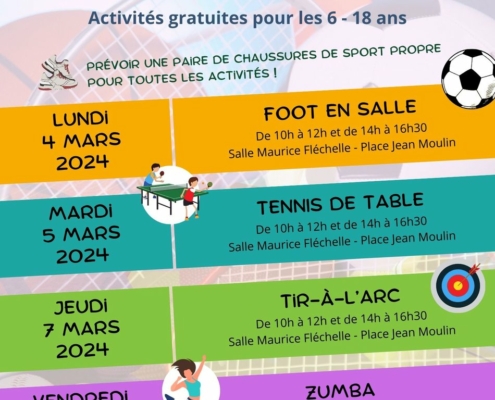 Les Tickets sport 🎯 reviennent pour les vacances d’hiver.Au programme : Lundi 4/03 : foot en salle Mardi 5/03 : tennis de table Jeudi 7/03 : tir-à-l’arc Vendredi 8/03 : zumba⚽…