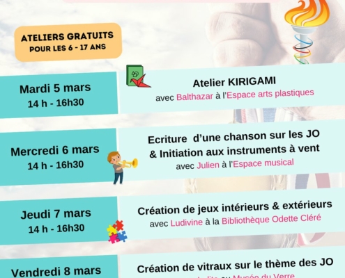 Les vacances d’hiver approchent 🤸❄Les tickets culture proposent les ateliers suivants, sur le thème des Jeux olympiques, aux enfants âgés de 6 à 17 ans : Mardi 5 mars : atelier…
