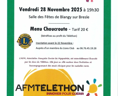 Repas du Téléthon Menu Choucroute – 20 € / pers. au bénéfice du Téléthon📞 Réservations avant le 22 novembre : 06 76 45 19 28. Horaires de l’évenement : 19h30…